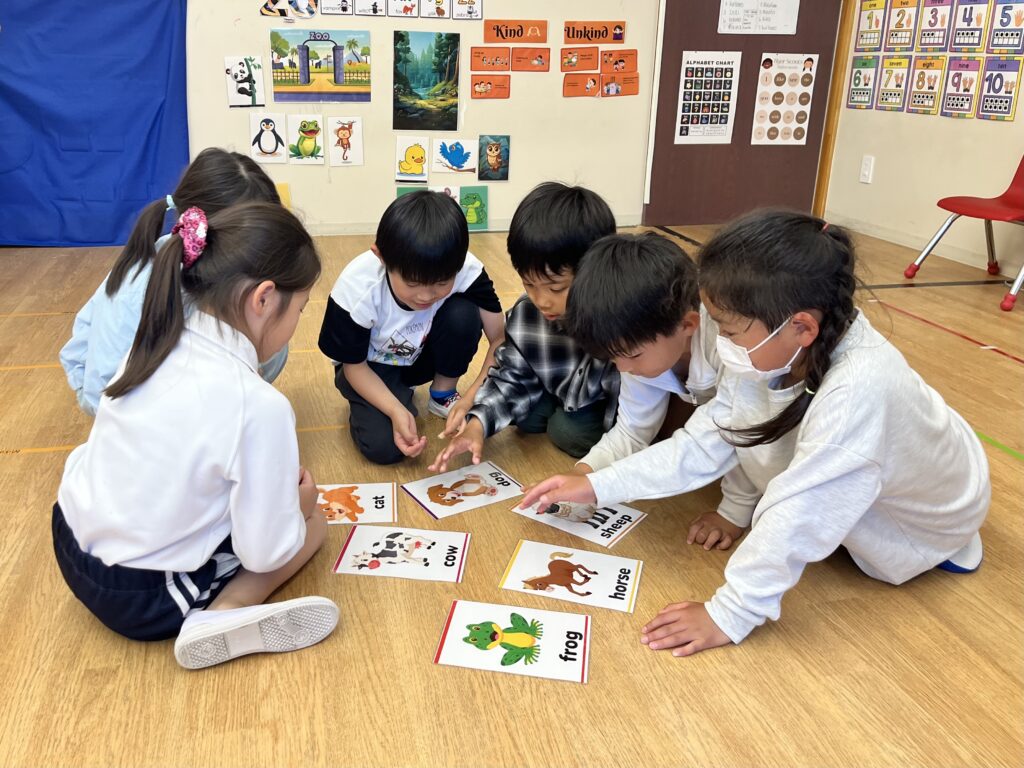 「I am a cow!」先生が言ったことをよく聞いて、ピクチャーカードを取っています。