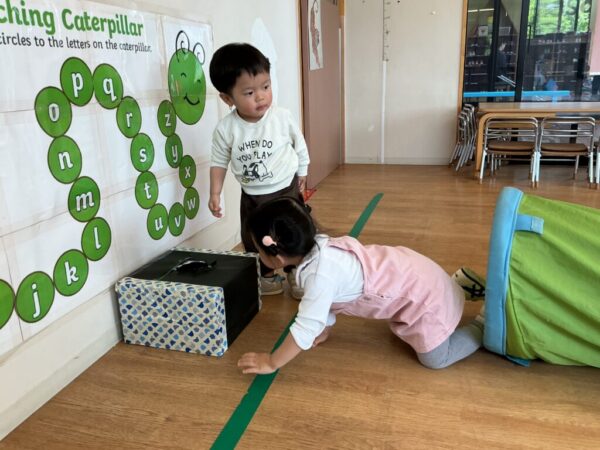 午後のGross motor skills では、カラーボールを持って、ステッピングストーンズを、バランスをとりながら進み、トンネルをくぐって、ゴールのボックスにボールをシュートするアクティビティを行いました🎾
