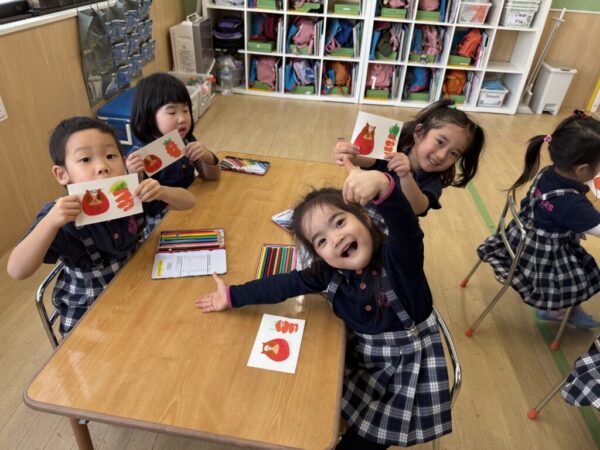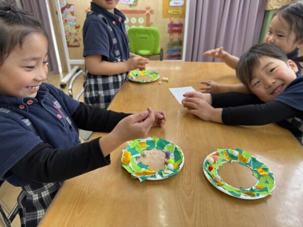 来年の干支・午年にちなんで、“馬のだるま”に折り紙を貼って飾ったり、こぶしスタンプでにんじんの形に見立ててペイントしたりと、手や指をたっぷり使いながら、のびのびと表現しました。