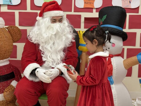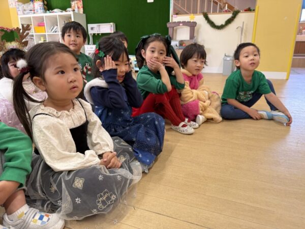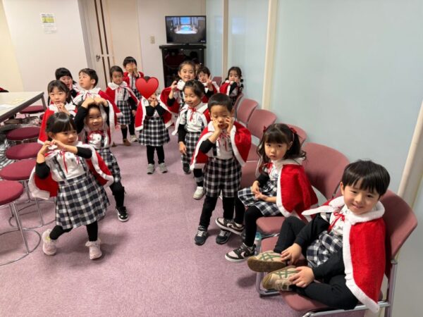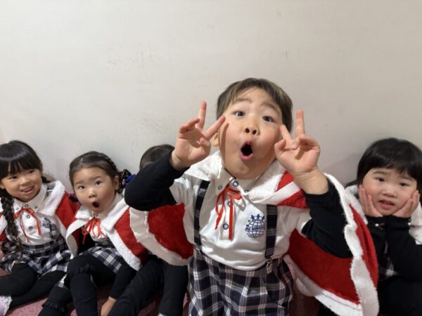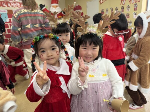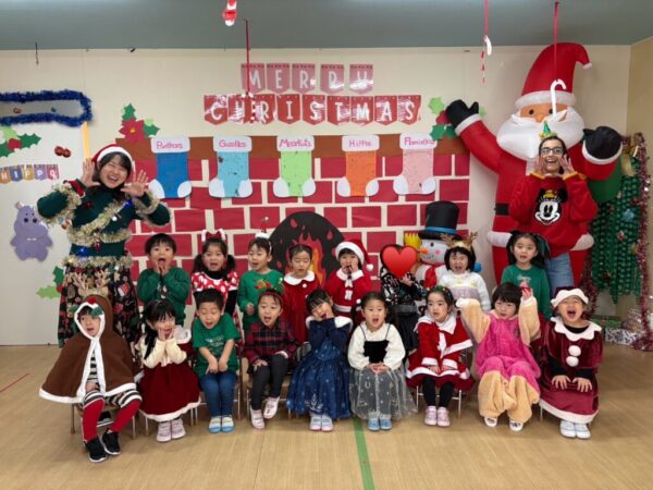 そして、年度最後の日は待ちに待った クリスマスパーティー!赤や緑のクリスマスカラーに身を包み、音楽に合わせてダンスをしたり、シューティングやゴルフ、ボール投げなどのゲームにも挑戦!