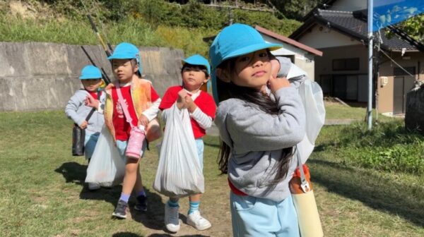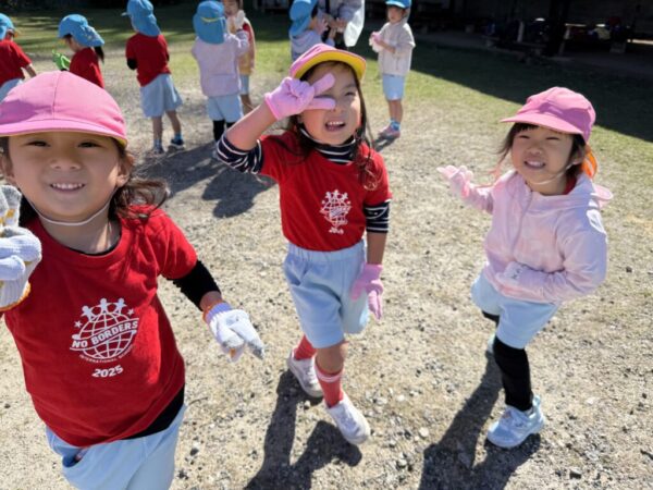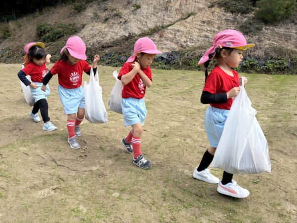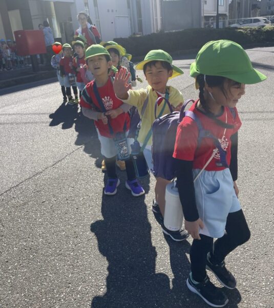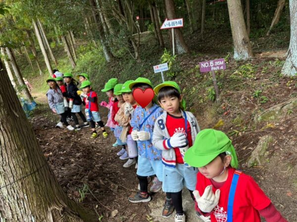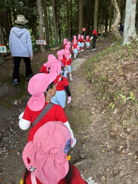 Meerkatクラス(年少)さんにとっては初めての芋掘り遠足。少し緊張しながらも、小さな足で一生懸命畑まで歩いていきます。