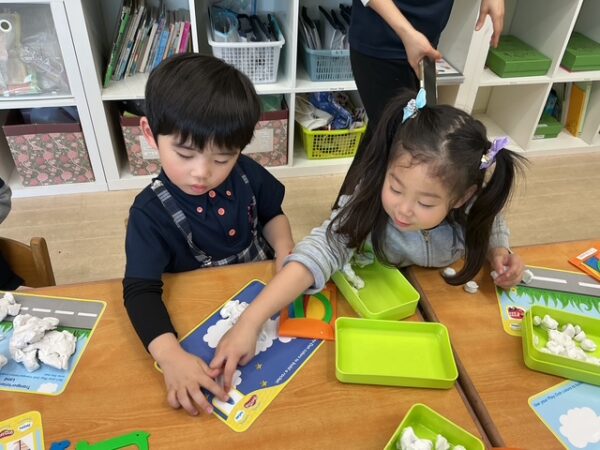 今月はTransportationについてのレッスンをしてます。粘土で、選んだカードに書かれてある場所にあった乗り物を作りました。