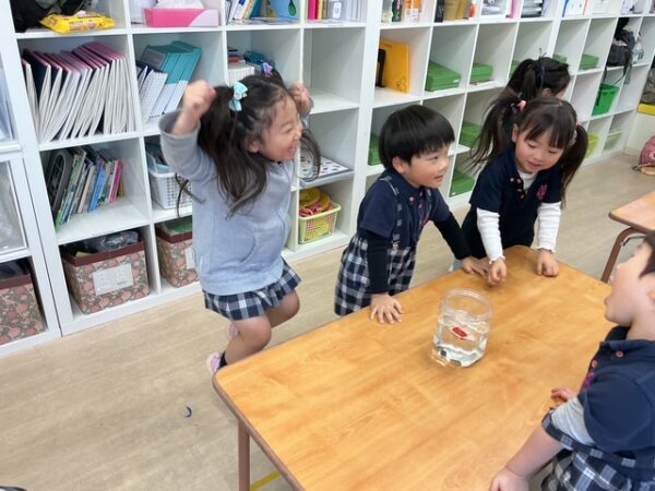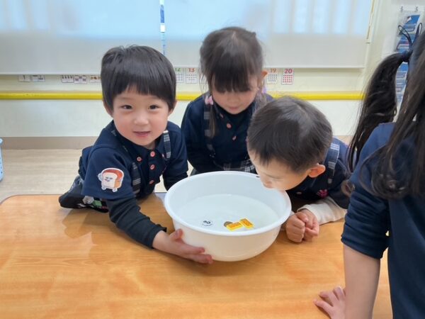 浮く?沈む?のレッスンでは、水の中に子どもたちの身近な物を実際に入れてみて、浮くか沈むかを考えました。