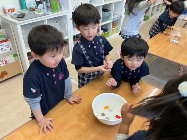 浮く?沈む?のレッスンでは、水の中に子どもたちの身近な物を実際に入れてみて、浮くか沈むかを考えました。