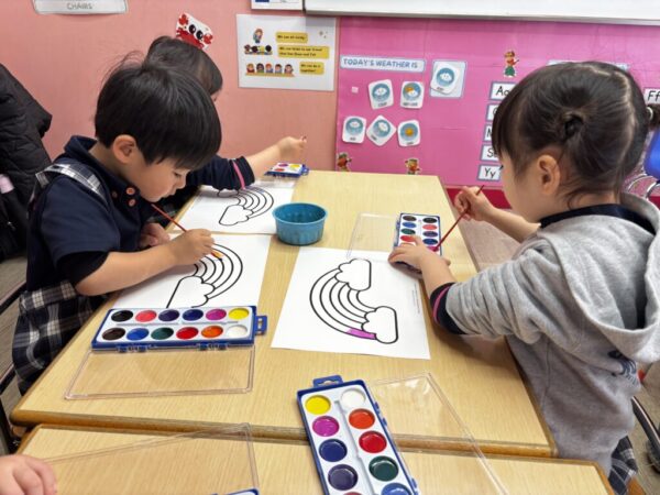 今日は水彩絵の具を使って虹に色を付けていきましたよ!