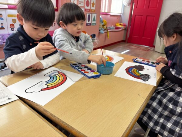 1色ずつ塗ってみたり、色を混ぜて塗ってみたり自分たちがイメージした虹を完成させました☆