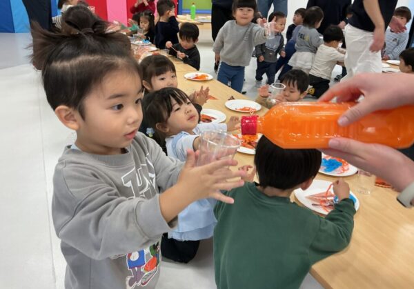 そして、orange(橙色)、yellow(黄色)、red(赤色)のお花紙を羽として丁寧に貼っていくお子さまたち🪶