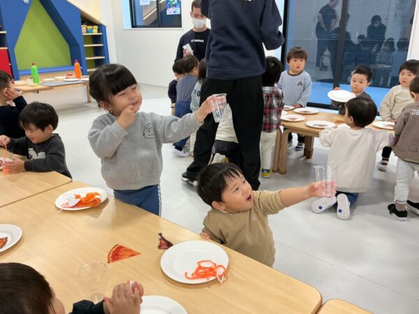 お子さまたちはもらう時には、『Turkey please!(ターキーをください!)』『Pie please!(パイをください!)』『Juice please!(ジュースをください!)』、そして受け取ると『Thank you!(ありがとう!)』と大きな声で言うことができましたよ✨