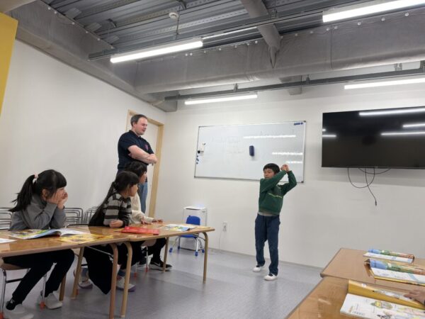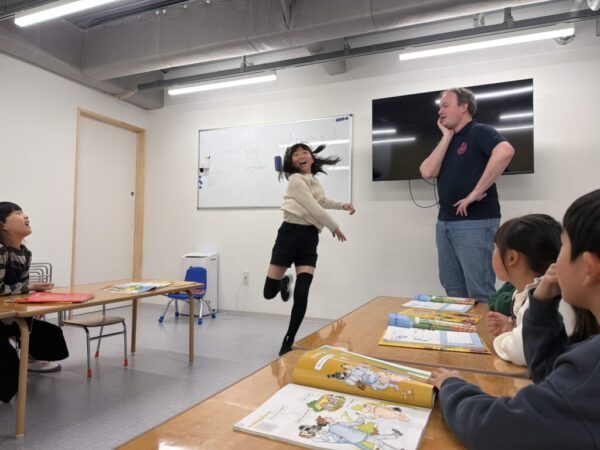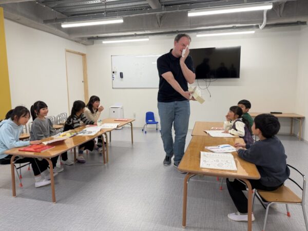 カナダ出身の講師はとあるスポーツをしている様子をパントマイムで見せています。