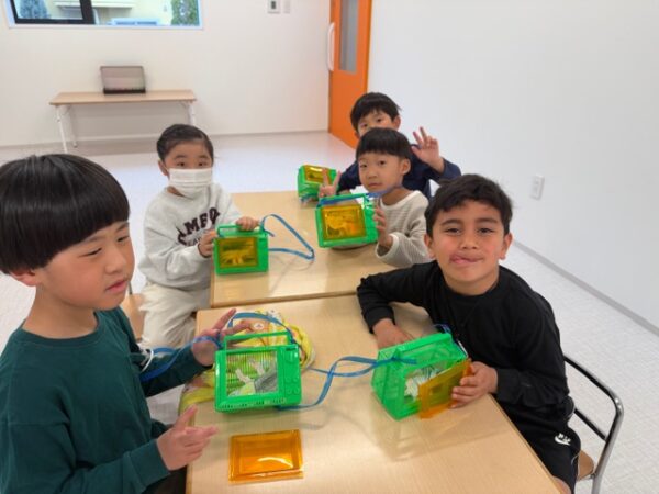 出来上がった虫を虫かごに入れて…