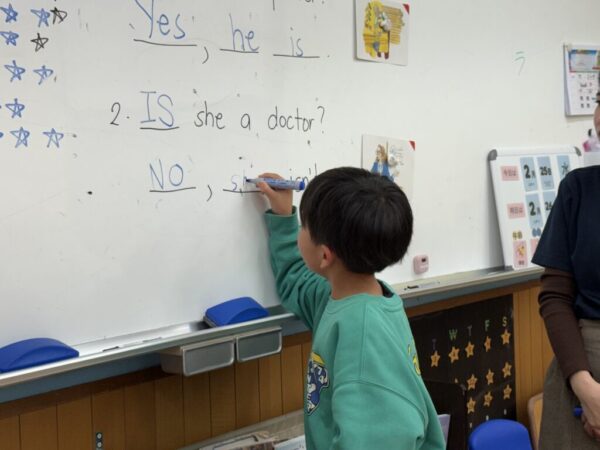 最後は「Is he a 〇〇?(彼は〇〇ですか?)」や「Is she a 〇〇?(彼女は〇〇ですか?)」という質問に「Yes, he/she is (はい そうです)」「No, he/she isn’t (いいえ ちがいます)」と答える回答をノートに書く練習をしました。