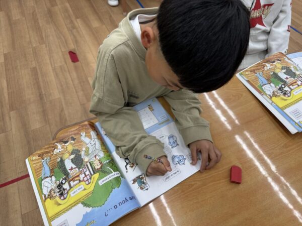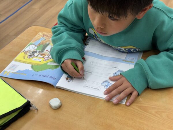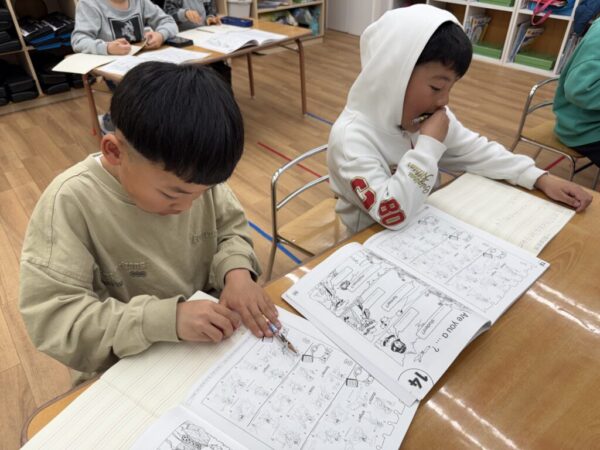 わからないときは講師と一緒にひとつひとつ確認をしてフォニックス通りに書いていきます。