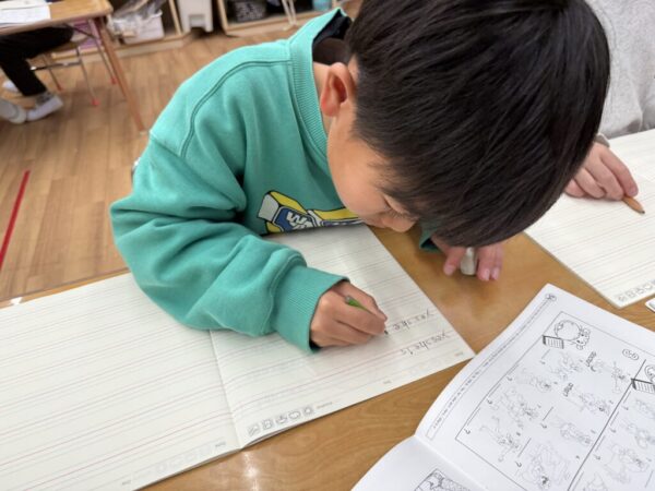 わからないときは講師と一緒にひとつひとつ確認をしてフォニックス通りに書いていきます。