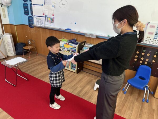 名前を呼ばれると「はい!」としっかり返事をし、受け取る姿からは大きな成長が感じられました。