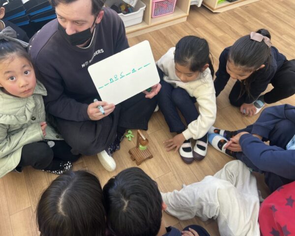 今回は少しレベルの高い単語にも挑戦し、「Maybe there is an E.(eはあるんじゃない?)」「That sound feels different.(その音じゃない気がする)」と、お友達同士で意見を出し合いながら進めていました。