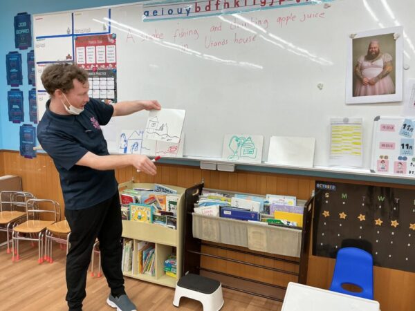 始めはみんなで色々な単語を出し合って先生がストーリーを作ります。