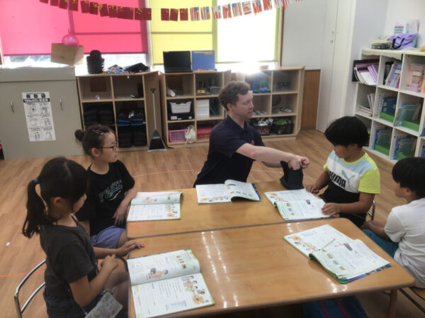 Jr. High Prepクラスでは、実際に中学校で使われているテキストを使用しています。この日は Where(どこ)とWhen(いつ)のページを取り組みました。登場人物の対話をペアで音読した後、Matt講師が用意した特別なBagでRole playをしました。セリフの一つ”What do you have in the bag?” (そのかばんの中には何があるの?)の質問に、Bagの中からカードを引いて答えます。”Vegetable ice cream”(野菜のアイスクリーム)や、” A pineapple man”など、面白い写真付きのカードで、お子様達は笑いながらRole playを楽しみました。