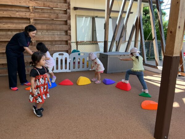 お外では三輪車に乗ったりシャボン玉で遊んだり、障害物競走をしたり体を大きく動かします!