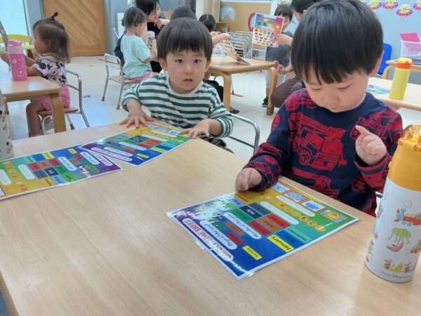 「How’s the weather today?(今日の天気はどうですか?)」と尋ねると絵を指して「It’s sunny☀️(晴れです!)」と大きい声で答えてくれました👍