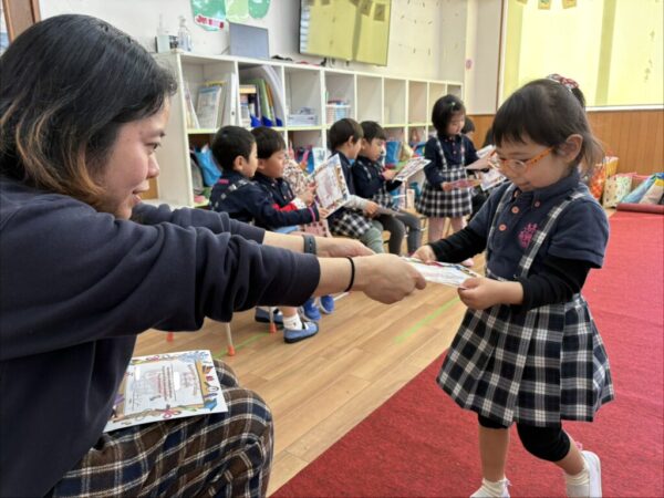 お子さま達は「Thank you!(ありがとう!)」「I love you!(大好きだよ!)」とお友達に伝えながらシールを渡していました。