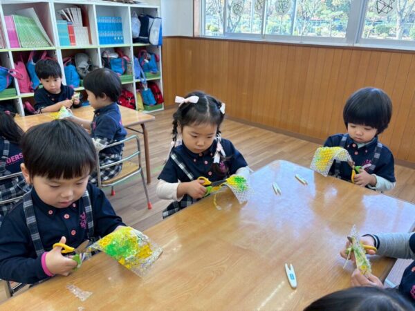年少さんはプチプチに黄色の絵の具をつけ、はさみを上手に使い、