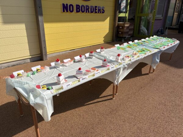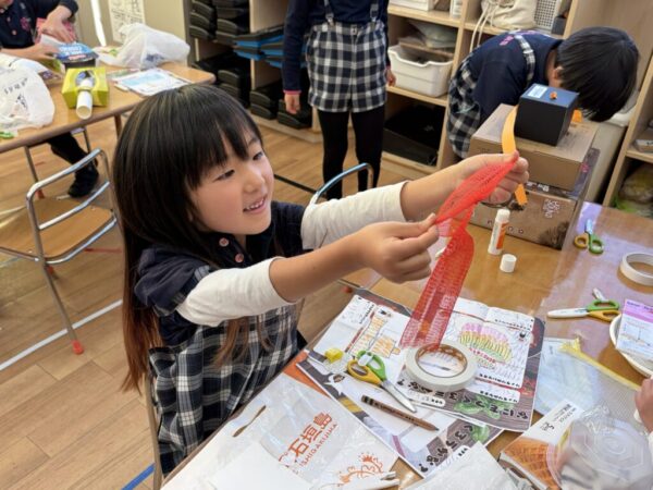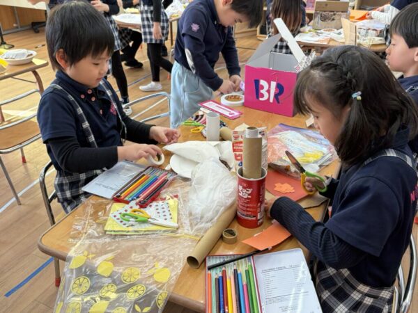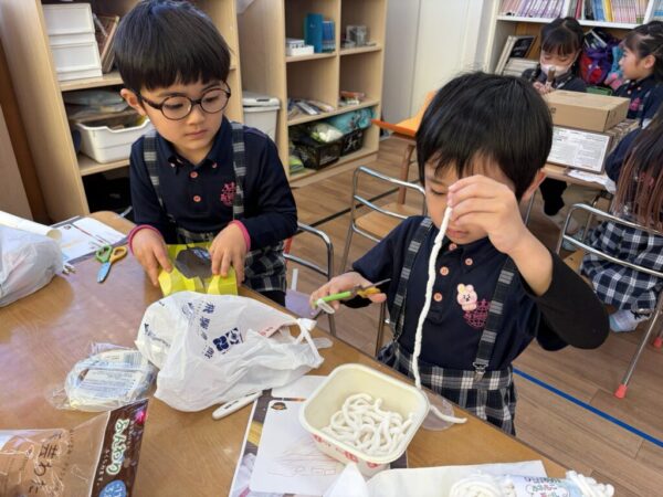みんなが持ってきてくれた廃材を再利用し、食べ物を完成させました☆