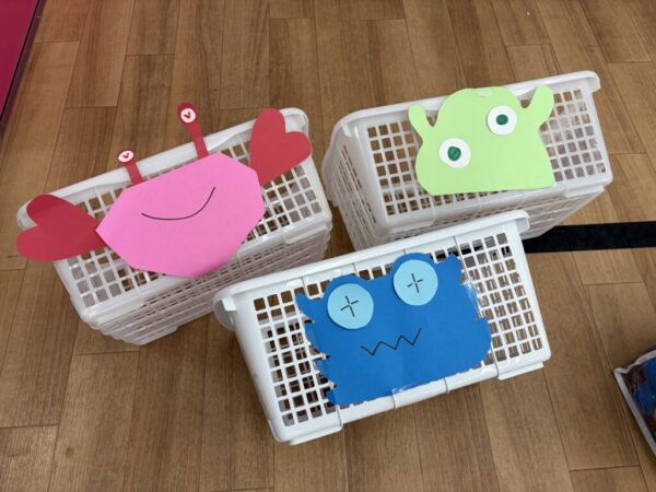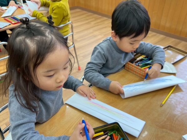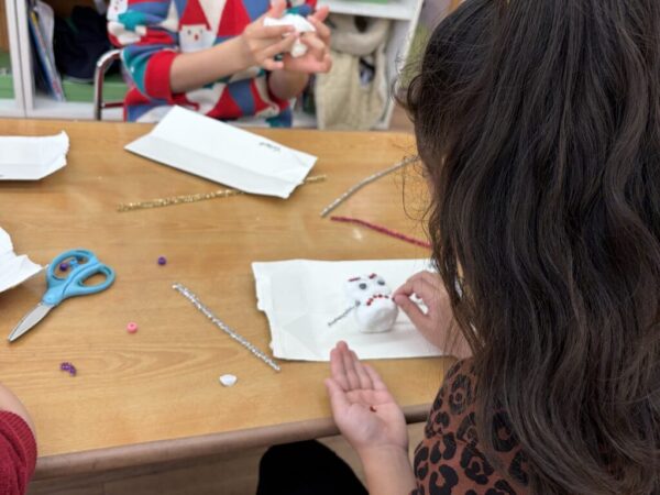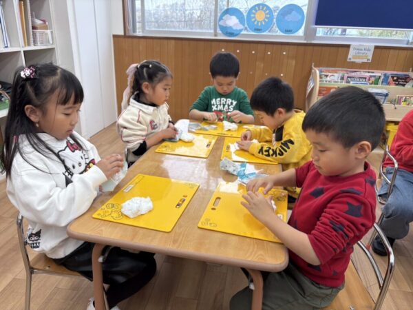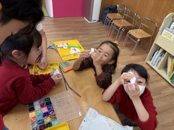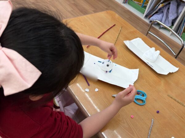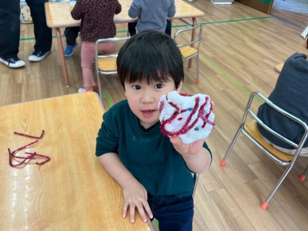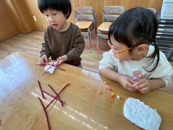モールやビーズを自由に使い、目を作ったり、口をつけたり、と工夫します。