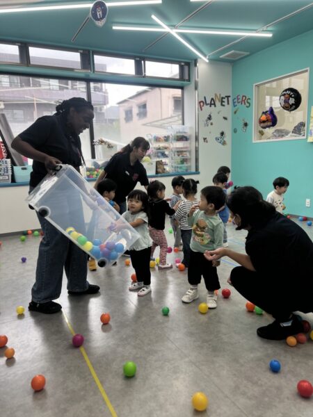 Rocketeersクラスの講師と一緒にカラーボールを使ってアクティビティを行いました!