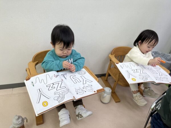 フォニックスの学習の様子です!クレヨンをしっかり握ってアルファベットをなぞりました。