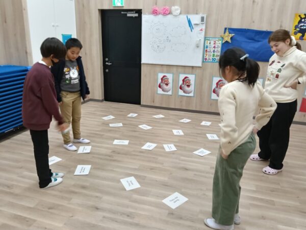 クラス中にフラッシュカードを配置しすごろくの様な遊びを楽しみました。
