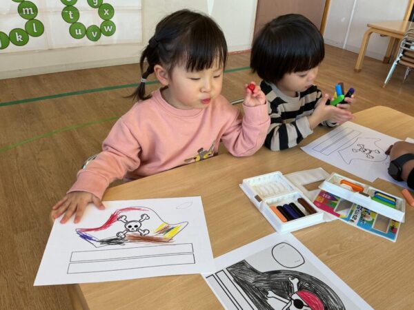 楽しく体を動かした後は、Pirates hatを作成しました。『I’m going to make it colorful!!』と言ってカラフルなPirates hatが出来上がりました⭐️So cool!!