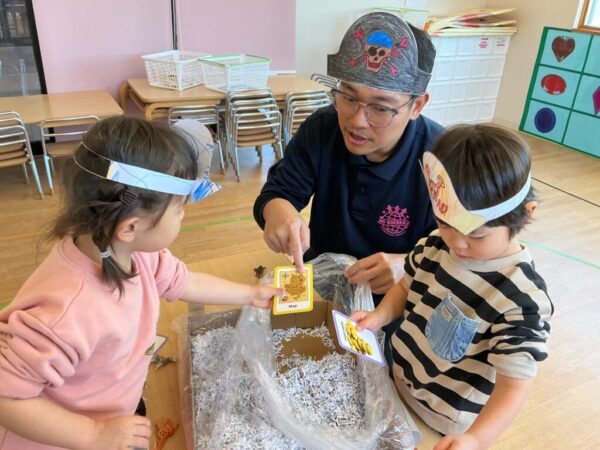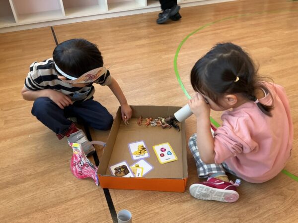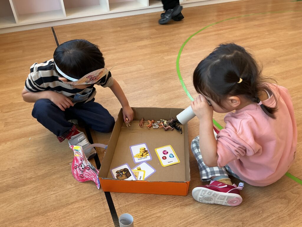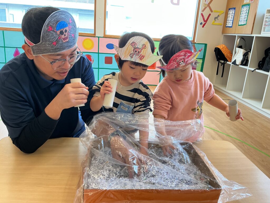 お次はTreasure hunting です⭐️pirates hatを被って、手にはtelescopeを持ってBoxの中のお宝を探します