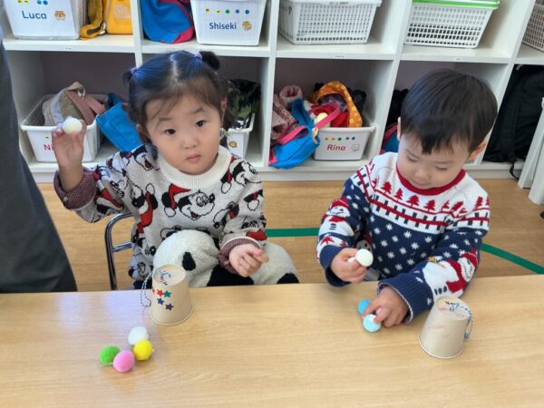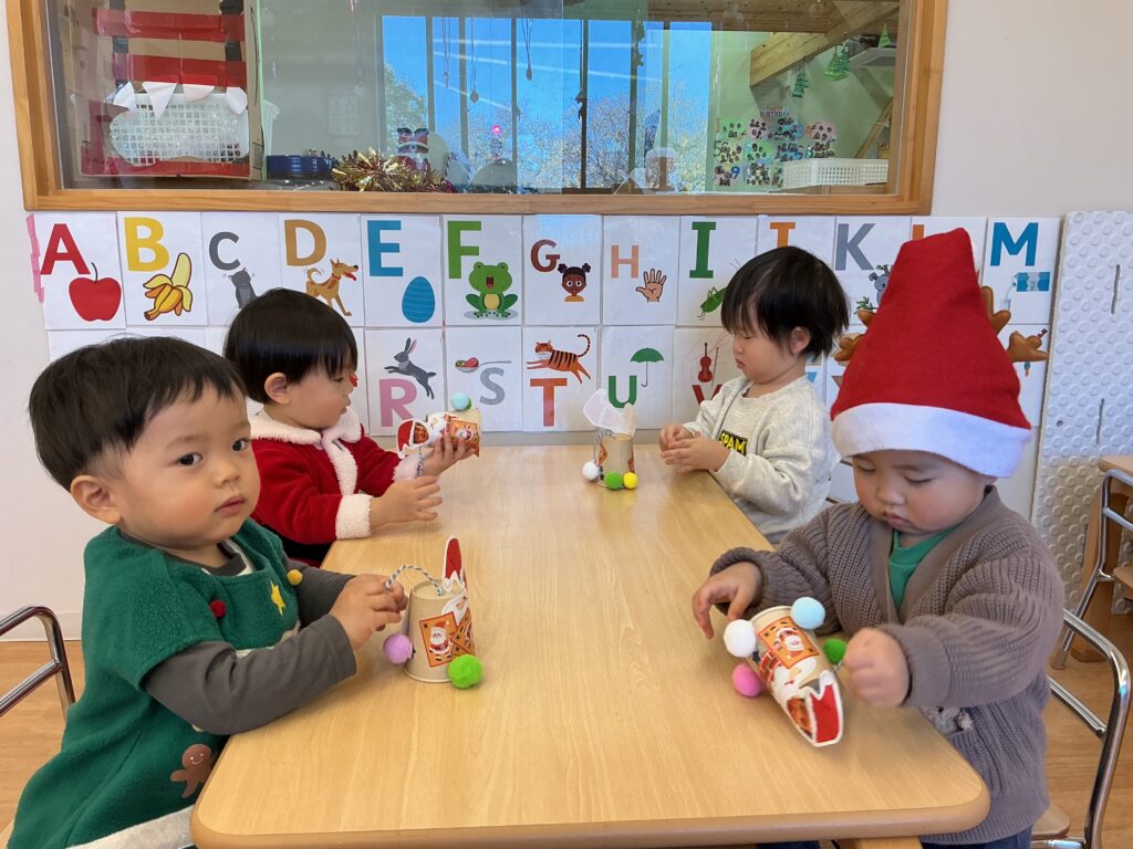 クリスマスウィークでは紙コップに鈴をつけたベルのクラフトをしました。