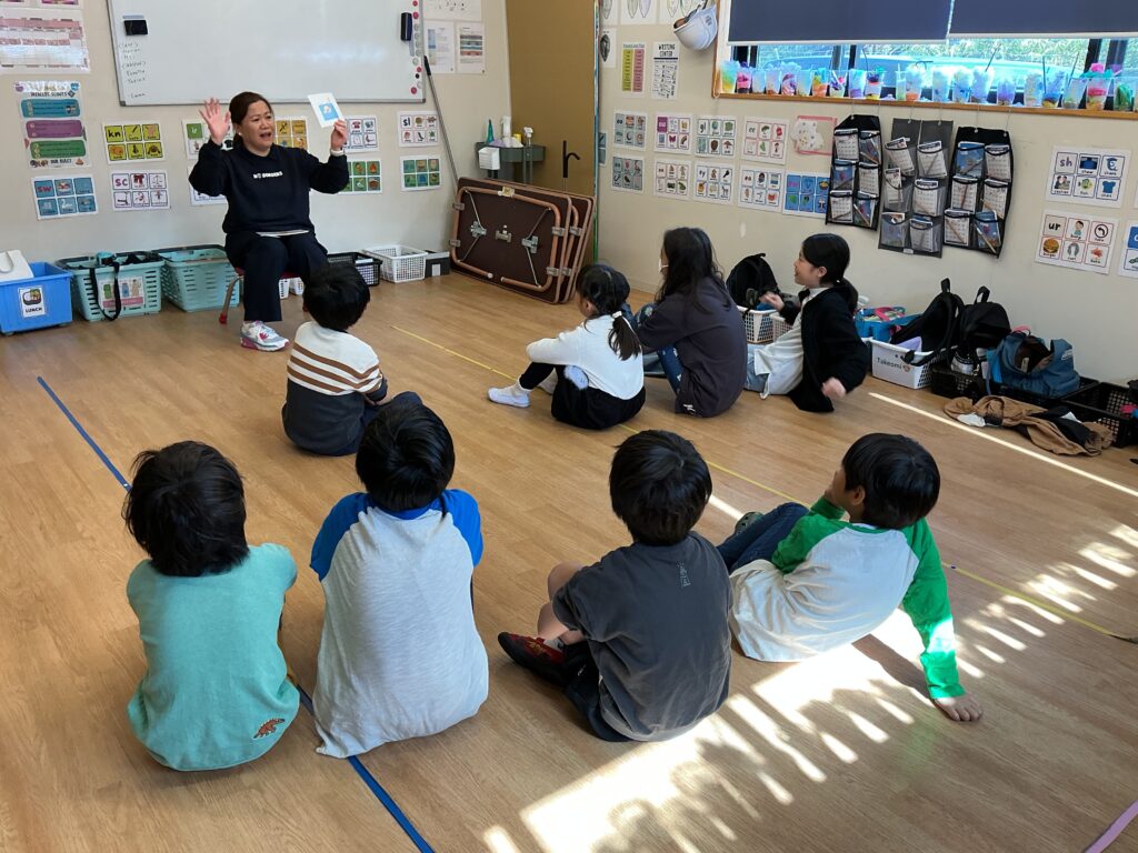サークルタイムでは、毎回さまざまなAction Verbsを学んでいます。