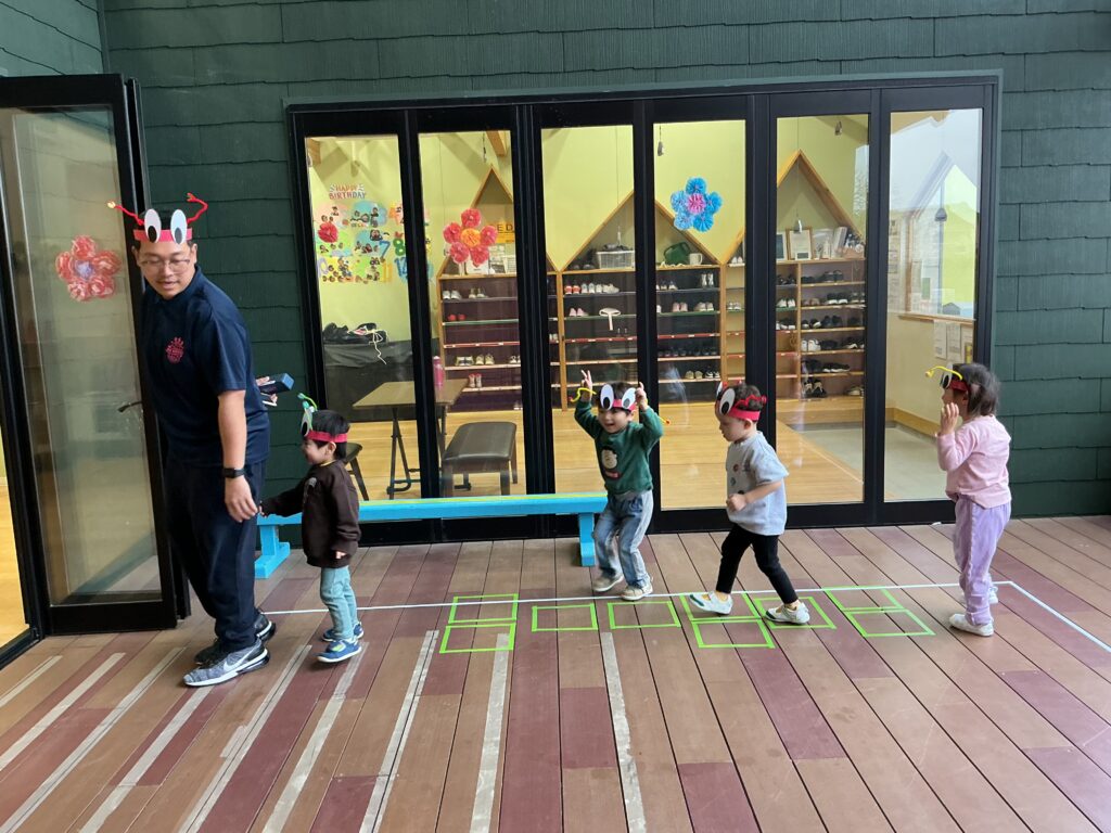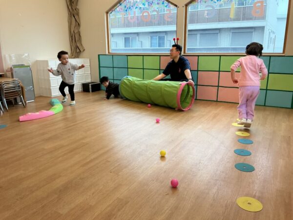 続いてのアクティビティは、『ants』(ありさん🐜)になりきって、餌に見立てたボールをお家である“穴🕳️“に隠していきます♪